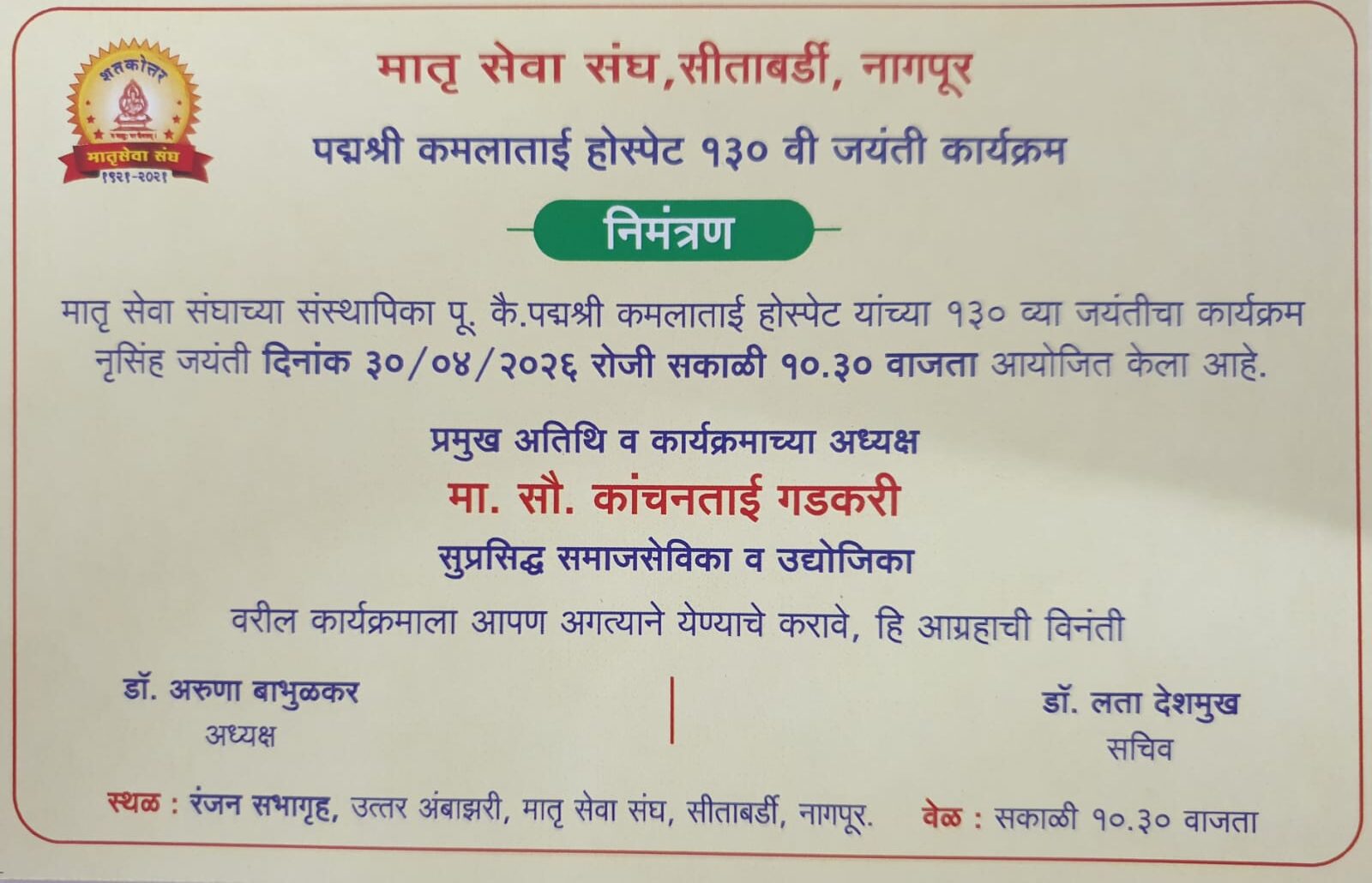 Founded in 1921 by Late Padmshri Kamalatai Hospet and Late Co-Founder Venutai Nene Matru Sewa Sangh (MSS) aspires to bestow better, affordable and low cost health care facilities for women and children of the marginalized community. Over the years, MSS has added a wide variety of other services to its ambit of work including. Maternity Home and , Institute of Social Work, School for mentally Retarded, Home for the Aged, Child Adoption Services, Working Women’s Hostel, Family Counseling Center.